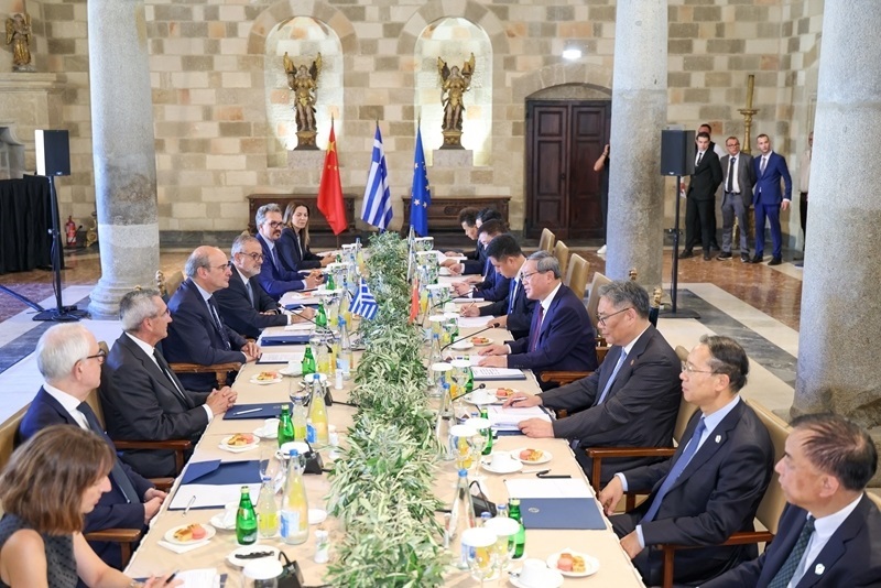 當(dāng)?shù)貢r間7月4日下午,國務(wù)院總理李強(qiáng)在希臘羅德島會見希臘副總理哈齊達(dá)基斯。新華社記者 劉彬 攝