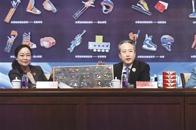 12月30日,北京冬奧組委召開市場開發(fā)、物流和注冊工作新聞發(fā)布會。圖為北京冬奧組委市場開發(fā)部部長樸學(xué)東(右)現(xiàn)場展示北京冬奧會特許商品。 新京報記者 陶冉 攝