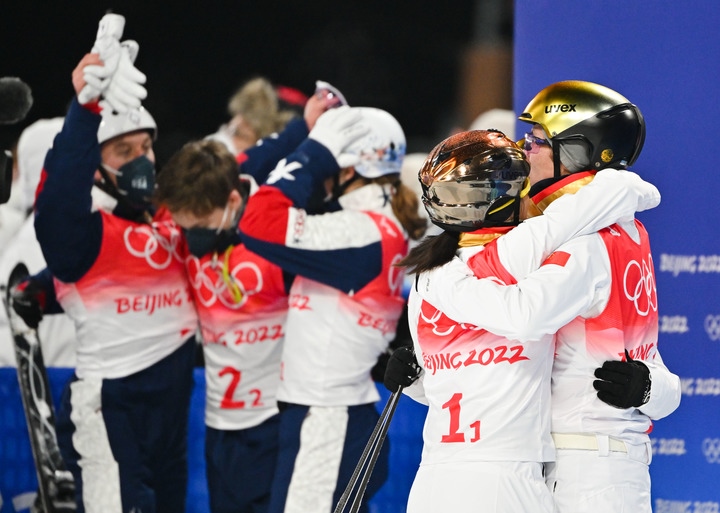 2月10日,賈宗洋(右)與徐夢桃賽后擁抱,美國隊在他們身后慶祝奪冠。新華社記者朱崢攝