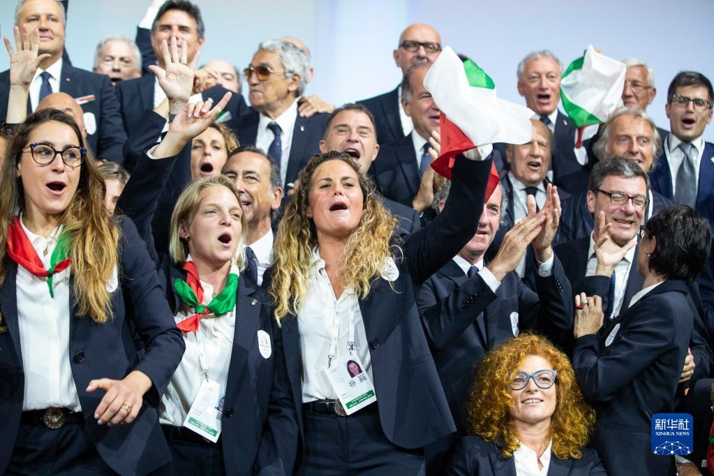 2019年6月24日,意大利米蘭/科爾蒂納丹佩佐申冬奧代表團成員慶祝獲得2026年冬奧會舉辦權。新華社記者徐金泉攝