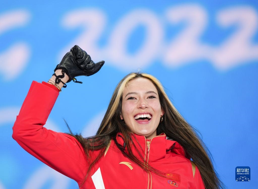 2月18日,冠軍中國(guó)隊(duì)選手谷愛凌在自由式滑雪女子U型場(chǎng)地技巧獎(jiǎng)牌頒發(fā)儀式上。新華社記者薛玉斌攝