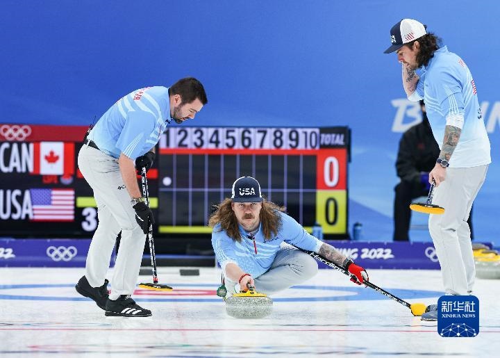 2月18日,美國(guó)隊(duì)選手馬特·漢密爾頓(中)在冰壺男子銅牌賽比賽中擲壺。新華社記者王婧嬙攝
