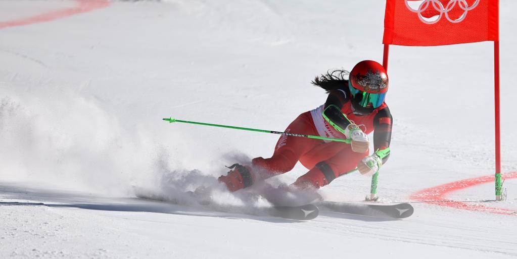 2月20日,中國(guó)隊(duì)選手孔凡影在北京冬奧會(huì)高山滑雪混合團(tuán)體項(xiàng)目比賽中。新華社記者陳斌攝