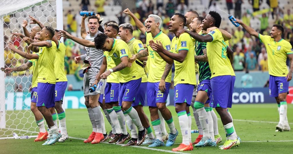 11月24日,巴西隊在賽后慶祝勝利。新華社記者徐子鑒攝