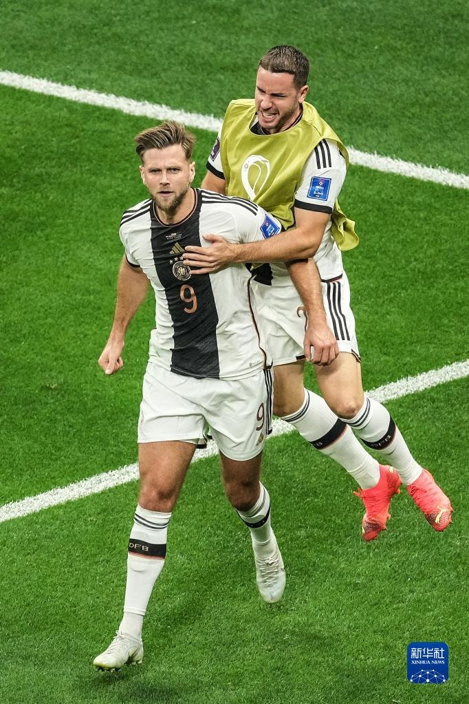 11月27日,德國(guó)隊(duì)球員尼克拉斯·菲爾克魯格(左)在比賽中進(jìn)球后與隊(duì)友慶祝。新華社記者 潘昱龍 攝