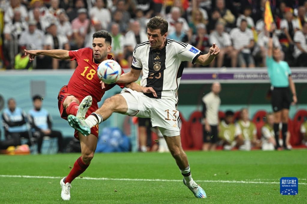 11月27日,西班牙隊(duì)球員阿爾巴(左)與德國(guó)隊(duì)球員托馬斯·穆勒在比賽中拼搶。新華社記者 李尕 攝