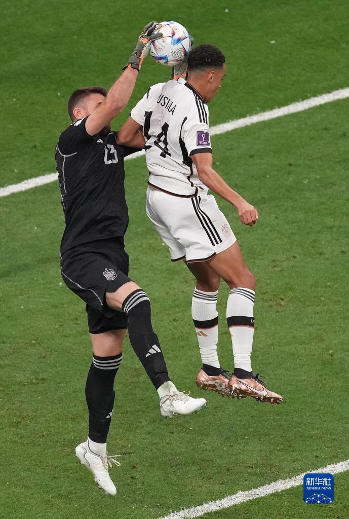 11月27日,德國(guó)隊(duì)球員賈邁勒·穆夏拉(右)與西班牙隊(duì)守門員烏奈·西蒙在比賽中拼搶。新華社記者 陳誠(chéng) 攝