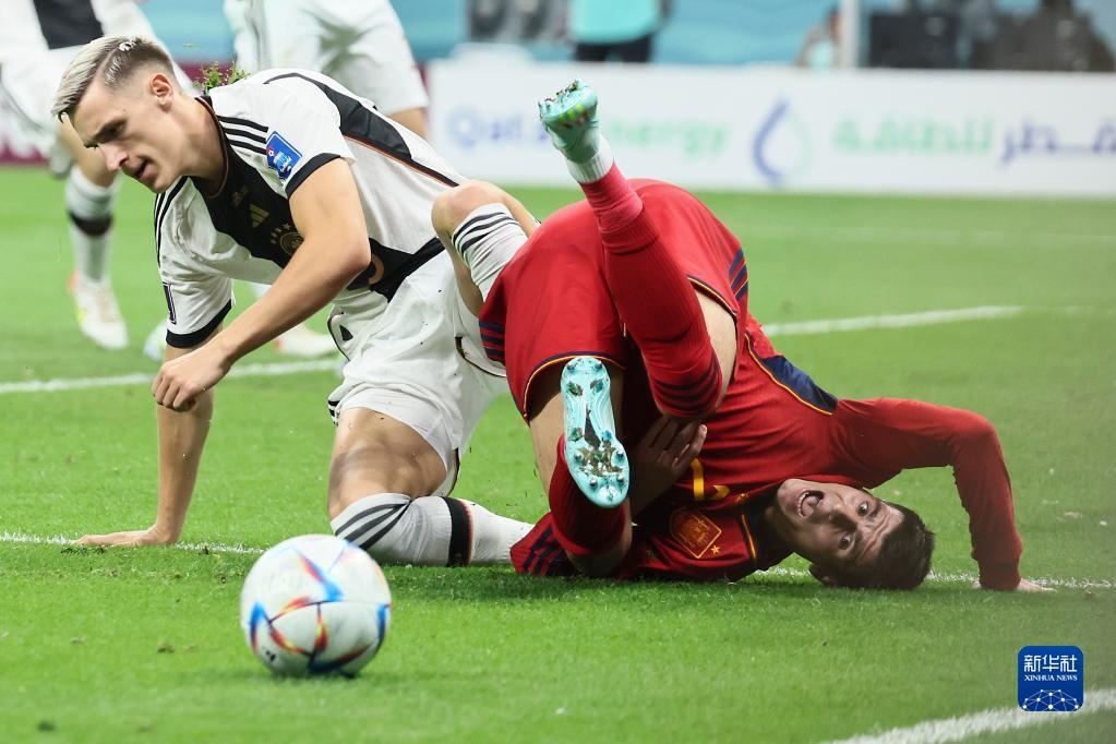 11月27日,西班牙隊(duì)球員莫拉塔(右)與德國(guó)隊(duì)球員尼科·施洛特貝克在比賽中拼搶。新華社記者 蘭紅光 攝