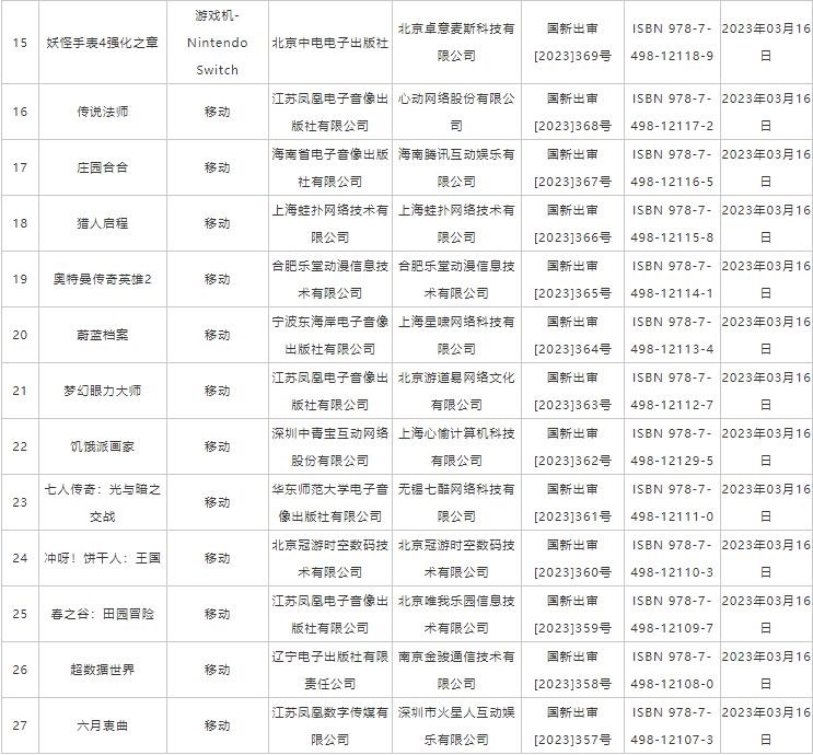 人民網(wǎng)北京3月21日電 (記者楊虞波羅)據(jù)國家新聞出版署官網(wǎng)消息,3月20日,2023年進(jìn)口網(wǎng)絡(luò)游戲?qū)徟畔⒄桨l(fā)布,共27款游戲獲得游戲版號,其中包含22款移動游戲、3款PC游戲、1款雙端游戲、1款NS游戲機(jī)游戲。