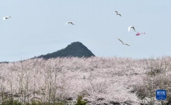 3月21日,一群鳥(niǎo)在貴州省貴安新區(qū)櫻花園內(nèi)飛翔。
