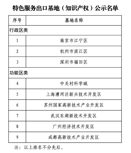據(jù)國家知識產(chǎn)權(quán)局官網(wǎng)消息,根據(jù)《商務(wù)部等7部門辦公廳(室)關(guān)于組織申報專業(yè)類特色服務(wù)出口基地的通知》(商辦服貿(mào)函〔2021〕355號)要求,經(jīng)地方申報、省市知識產(chǎn)權(quán)和商務(wù)主管部門初審?fù)扑]、第三方機構(gòu)客觀指標(biāo)評審、專家評審、部門工作組復(fù)核等程序,初步認(rèn)定知識產(chǎn)權(quán)服務(wù)出口基地9家,名單于2月7日-2月11日進(jìn)行公示。