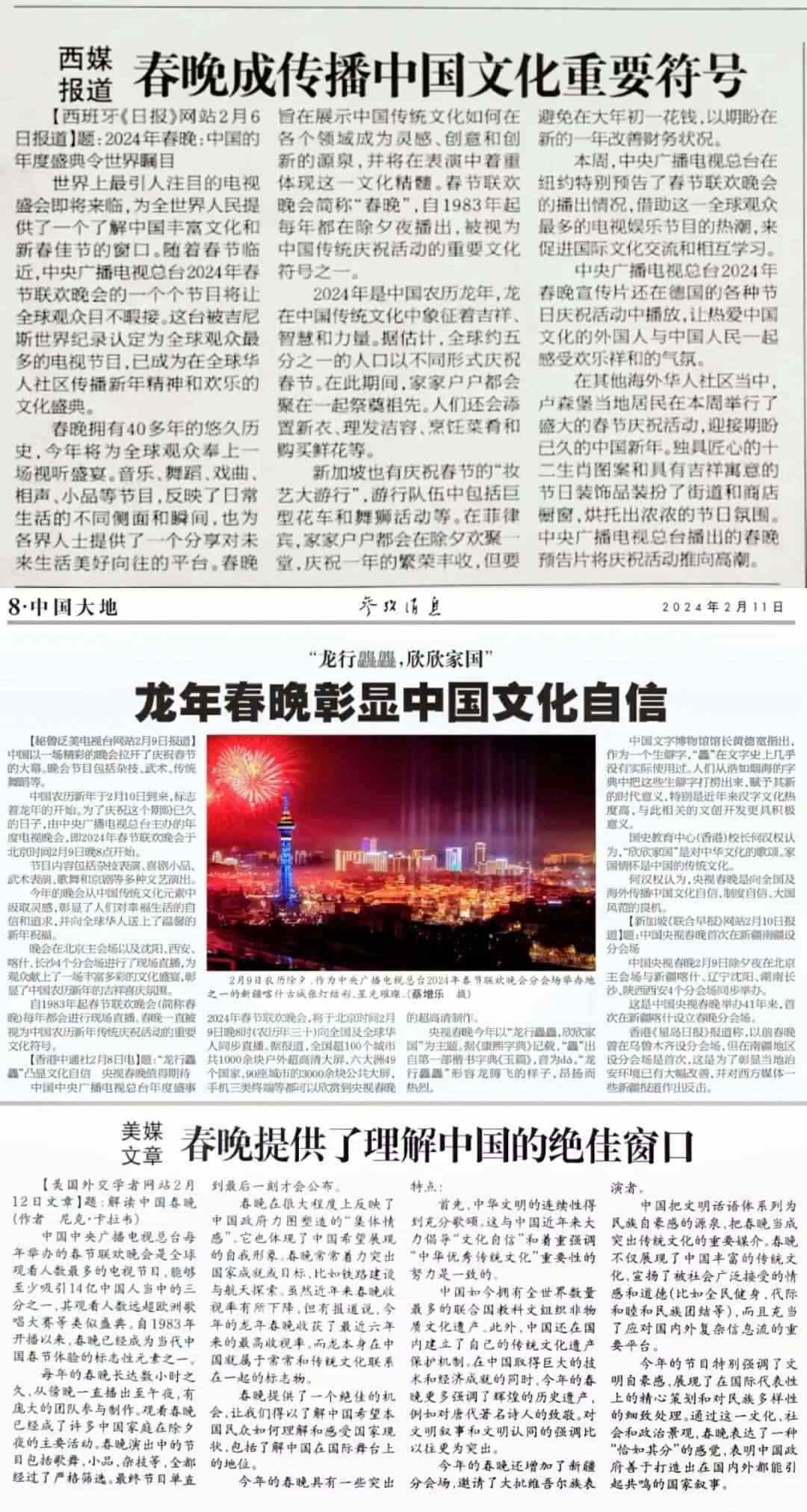 《參考消息》援引西班牙媒體評論稱,總臺龍年春晚為全世界人民提供了一個了解中國豐富文化的窗口,它展示中國傳統(tǒng)文化如何在各個領(lǐng)域成為靈感、創(chuàng)意和創(chuàng)新的源泉,并在音樂、舞蹈、戲曲等節(jié)目中體現(xiàn)傳統(tǒng)文化的精髓。秘魯、新加坡等媒體報道稱,龍年春晚彰顯了中國的文化自信。而美國《外交學(xué)者》網(wǎng)站署名文章認(rèn)為,龍年春晚為世界提供了理解中國的絕佳窗口。海外媒體的這些報道,不約而同地使用了“文化符號”“標(biāo)志性元素”等詞匯,并從促進文化理解、推動文化交流等角度對總臺春晚的海外影響力進行解讀。