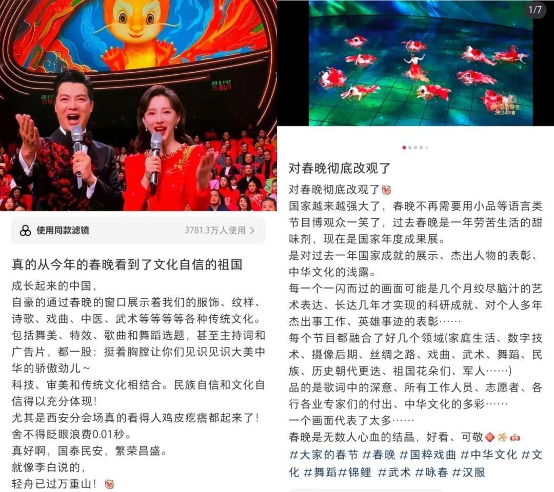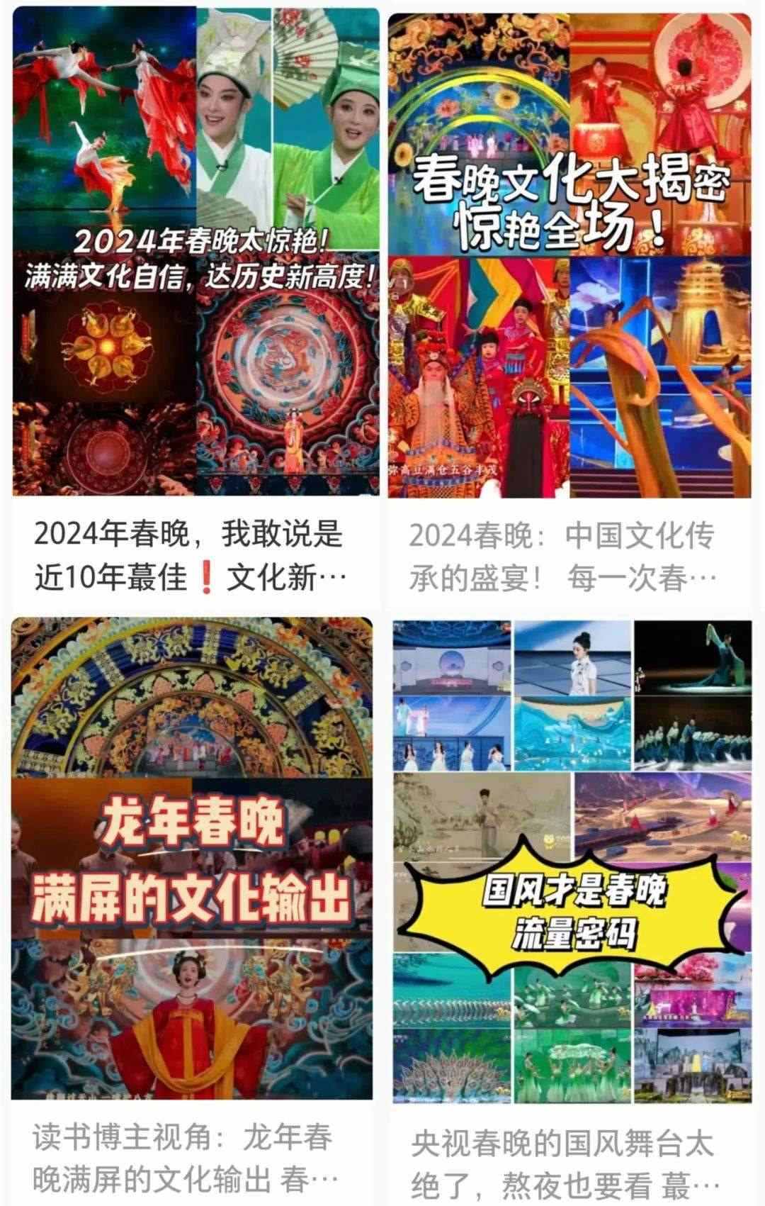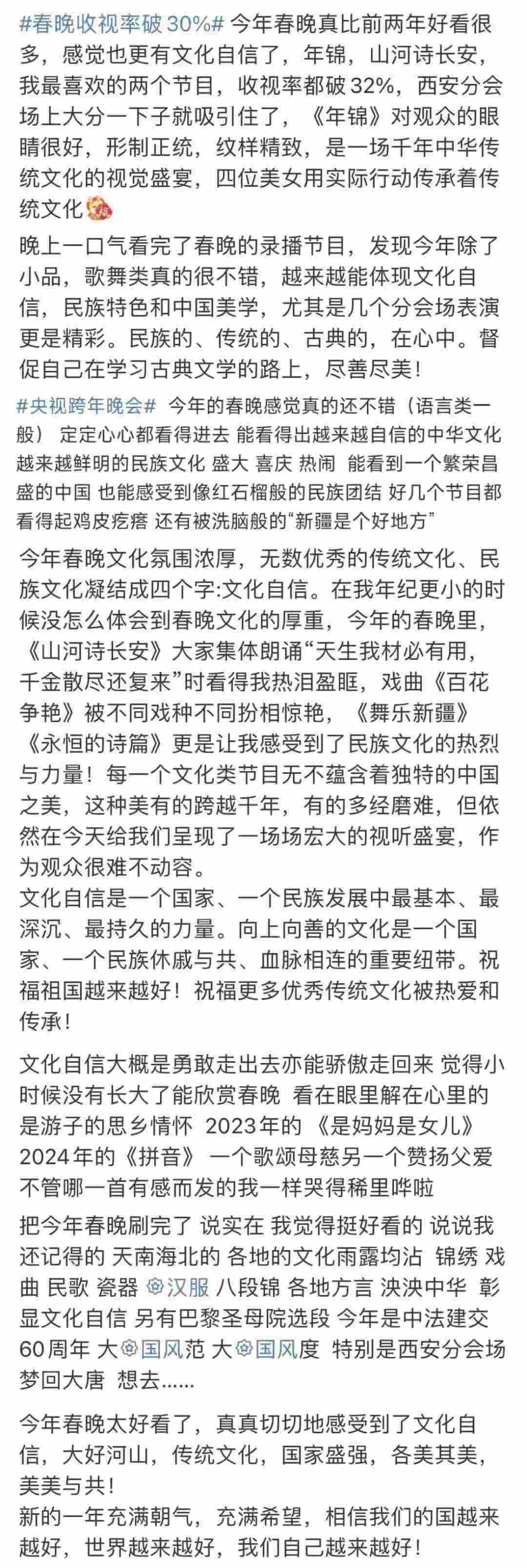 春晚的文化展現(xiàn),在國人中也引起了熱烈反響?!懊恳粋€文化類節(jié)目都蘊含著獨特的中國之美,這種美有的跨越千年,有的多經(jīng)磨難,春晚給我們呈現(xiàn)了一場場宏大的視聽盛宴,作為觀眾很難不動容”“從今年春晚真真切切地感受到了文化自信,大好河山,傳統(tǒng)文化,國家強盛,美美與共”“文化傳統(tǒng)特色給各個節(jié)目都刷了創(chuàng)意的漆,霸氣從節(jié)目中升騰,自信從感嘆中生發(fā),真妙”......