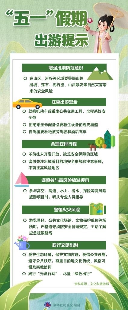 文化和旅游部近日發(fā)布“五一”假期出游提示,提醒廣大游客增強(qiáng)汛期防范意識、注重出游安全、合理安排行程、謹(jǐn)慎參與高風(fēng)險旅游項(xiàng)目、警惕火災(zāi)風(fēng)險、踐行文明出游。