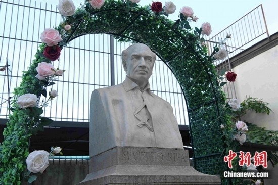圖為6月17日拍攝的“中國學(xué)院”舊址的庭院中的馬國賢雕像。 中新社記者 李洋 攝