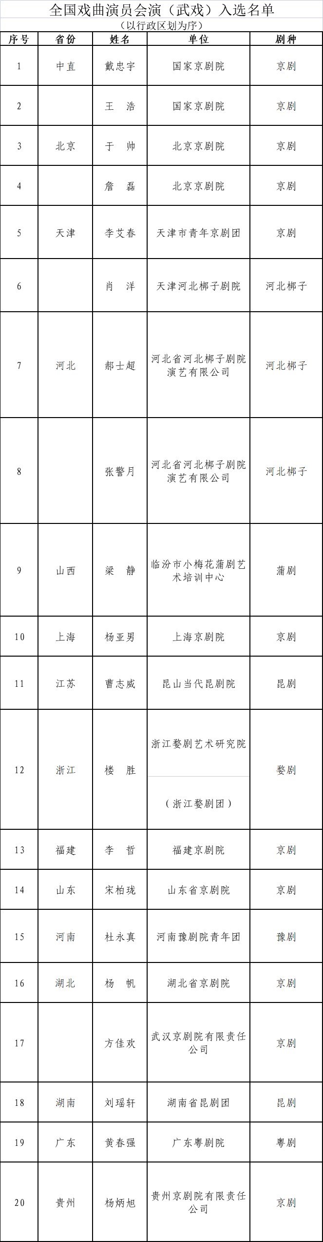 人民網(wǎng)北京3月25日電 (記者楊虞波羅)據(jù)文化和旅游部官網(wǎng)消息,日前,全國戲曲演員會演(武戲)遴選和公示工作已結(jié)束?,F(xiàn)將入選名單予以公布,并就有關事項函告如下。