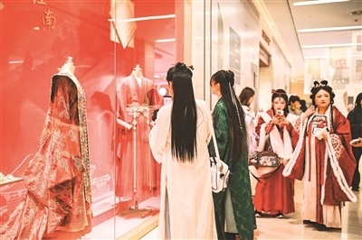 觀眾觀賞“錦繡江南”特展展出的影視劇服飾。