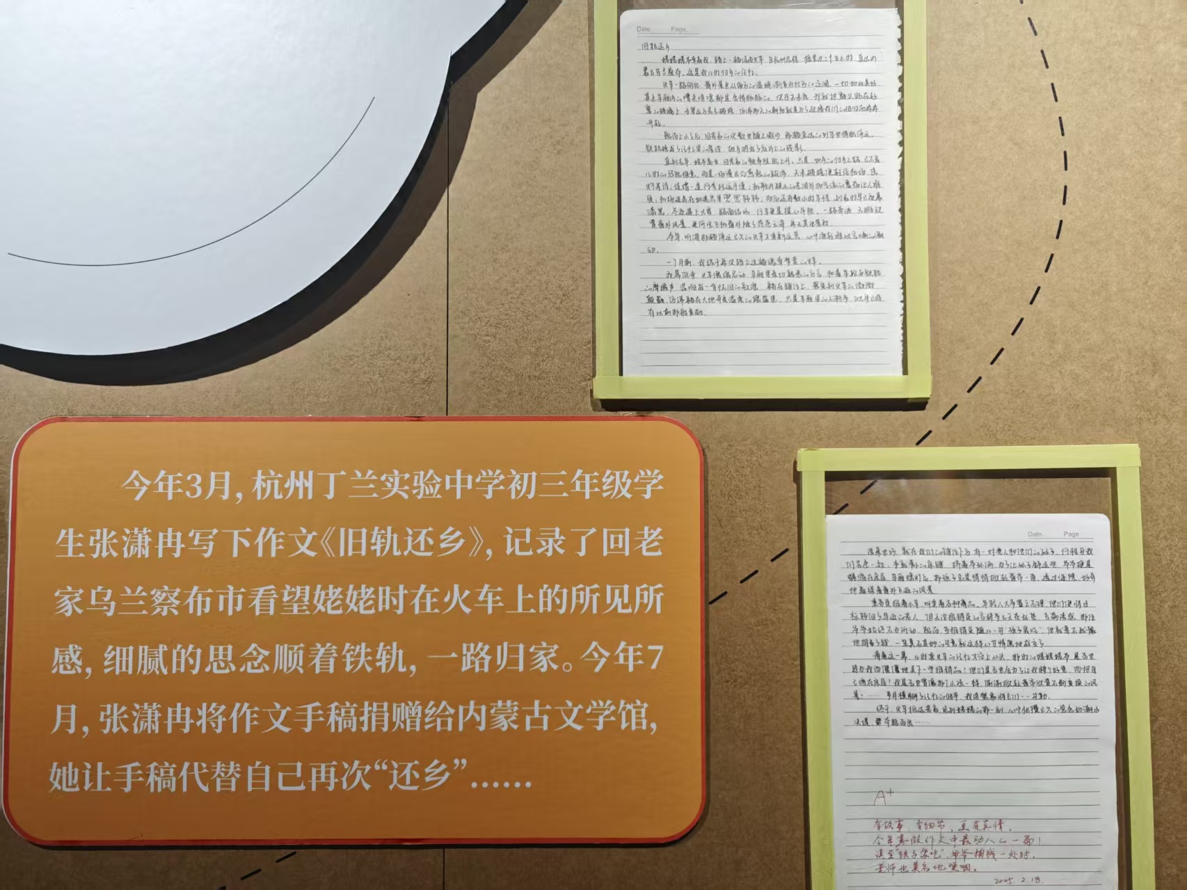 值得一提的是,憑借作文《舊軌還鄉(xiāng)》引起網(wǎng)友廣泛關(guān)注和共鳴的內(nèi)蒙古籍女孩張瀟冉,今年7月將手稿捐贈給了內(nèi)蒙古文學(xué)館,本次展覽對《舊軌還鄉(xiāng)》手稿進(jìn)行展出。展覽還展出了生于2007年的少女詩人姜二嫚的詩作,年少成名的姜二嫚用7歲時所作的《光》向全國小詩人們送上問候。