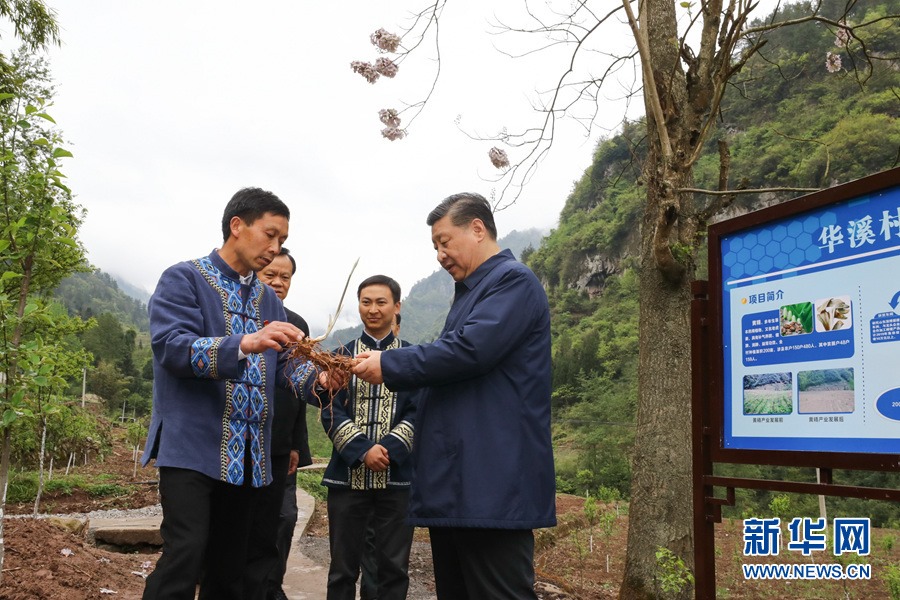 這是4月15日下午,習(xí)近平在石柱土家族自治縣中益鄉(xiāng)華溪村了解該村通過種植中藥材黃精等特色經(jīng)濟(jì)作物帶動(dòng)村民脫貧的情況。 新華社記者 鞠鵬 攝