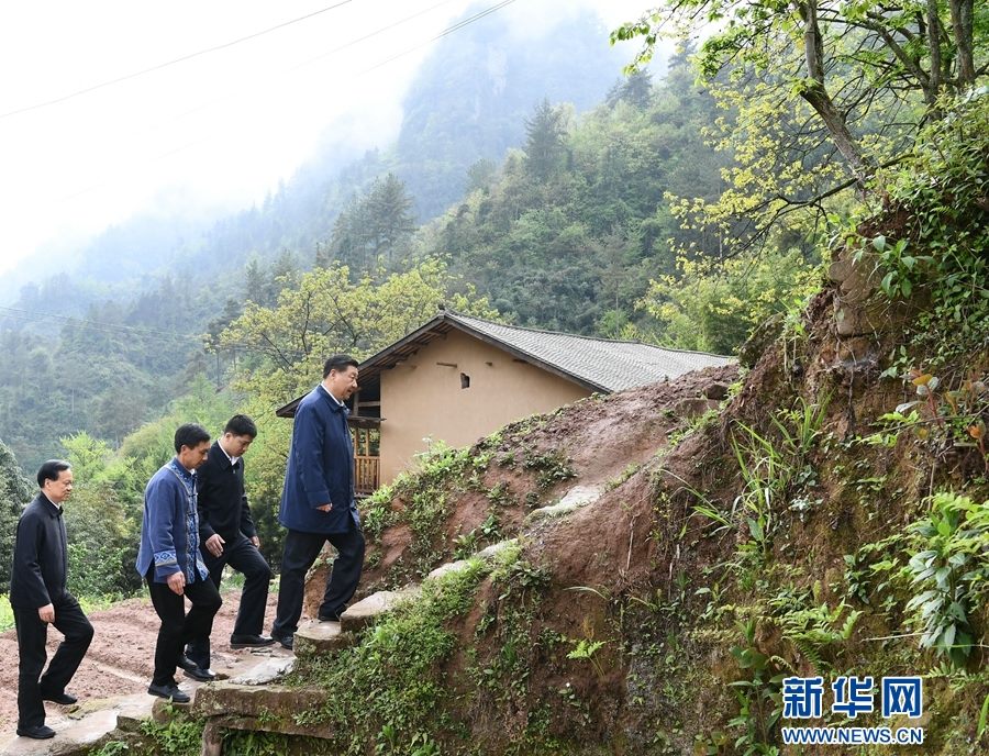 這是4月15日下午,在石柱土家族自治縣中益鄉(xiāng)華溪村,習(xí)近平踏著濕滑的石階登上陡坡,前往貧困戶譚登周家看望。 新華社記者 謝環(huán)馳 攝