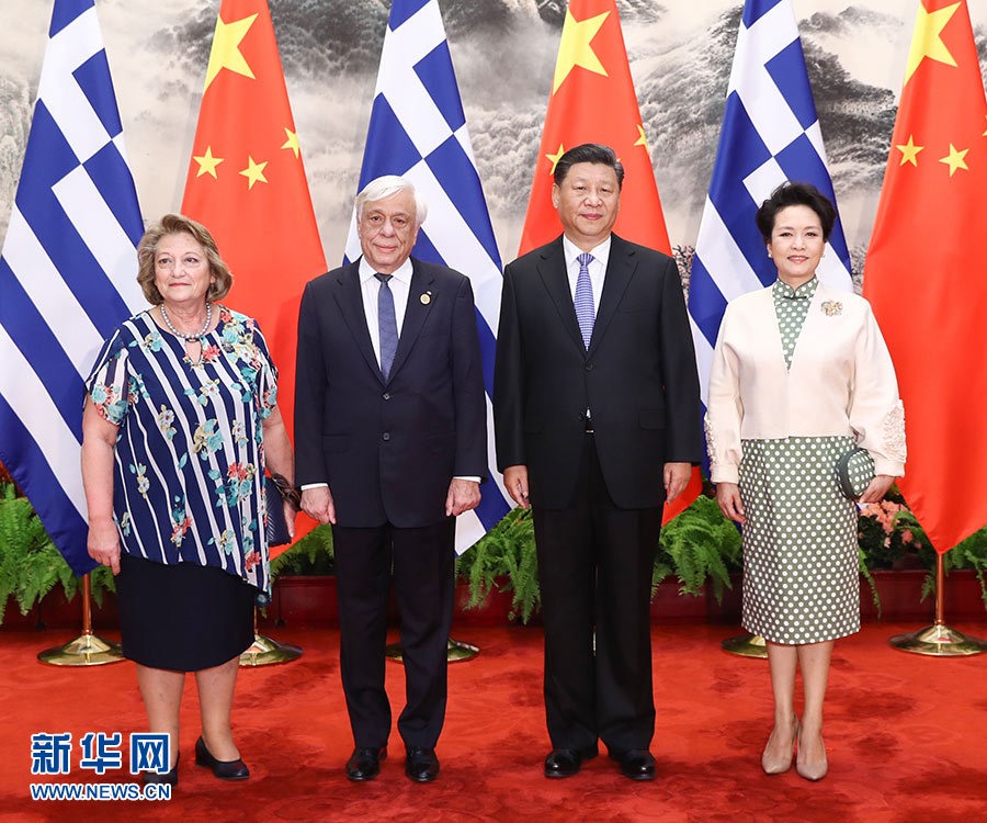 5月14日,國家主席習近平在北京人民大會堂同希臘總統(tǒng)帕夫洛普洛斯舉行會談。這是習近平和夫人彭麗媛同帕夫洛普洛斯夫婦合影。 新華社記者 鞠鵬 攝