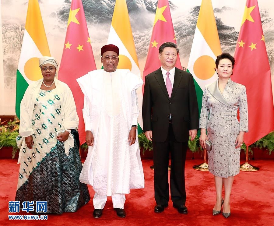 5月28日,國家主席習(xí)近平在北京人民大會(huì)堂同尼日爾總統(tǒng)伊素福舉行會(huì)談。這是習(xí)近平和夫人彭麗媛同伊素福夫婦合影。