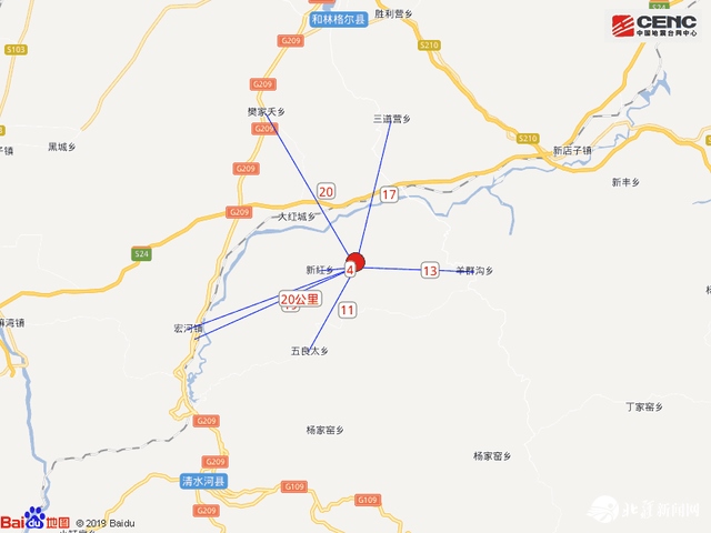 震中距和林格爾縣27公里、距清水河縣29公里、距山西右玉縣55公里、距托克托縣58公里、距準(zhǔn)格爾旗60公里,距呼和浩特市76公里?! ?/p>