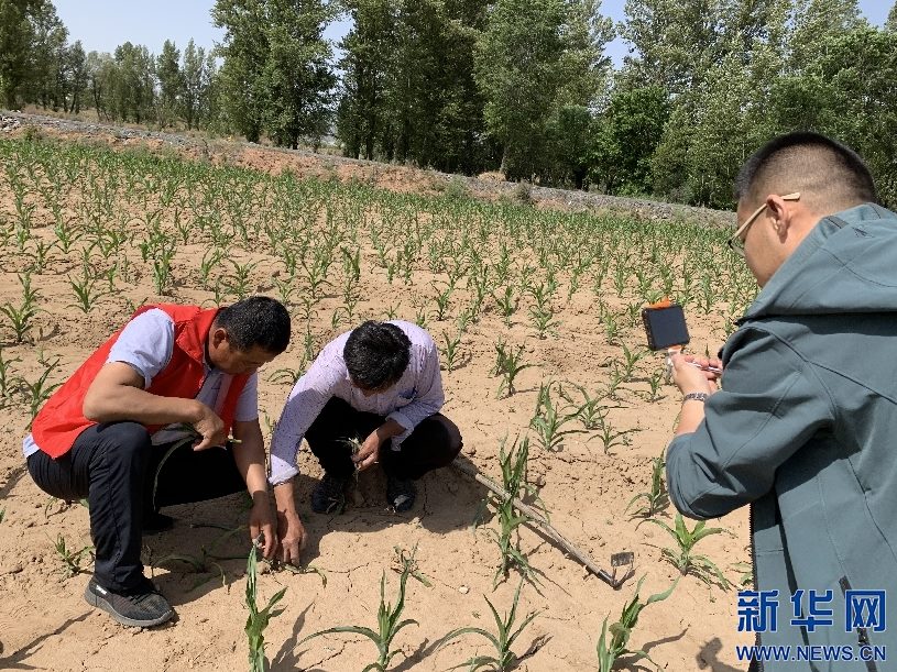 6月10日,內(nèi)蒙古自治區(qū)烏審旗無定河鎮(zhèn)農(nóng)業(yè)“土專家”在玉米地里針對小地老虎病蟲害問題,進行線上直播,向當(dāng)?shù)剞r(nóng)民講解防治方法。新華網(wǎng)曹楨攝