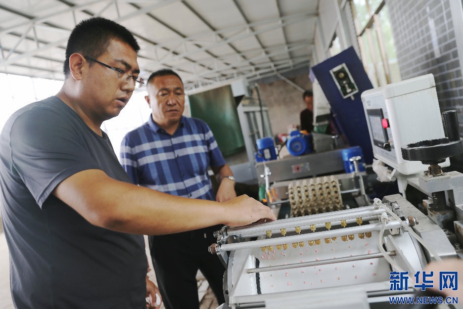 6月9日,李宏和李鵬博在廠房里操作自動播種機播種辣椒苗。新華網(wǎng)曹楨攝