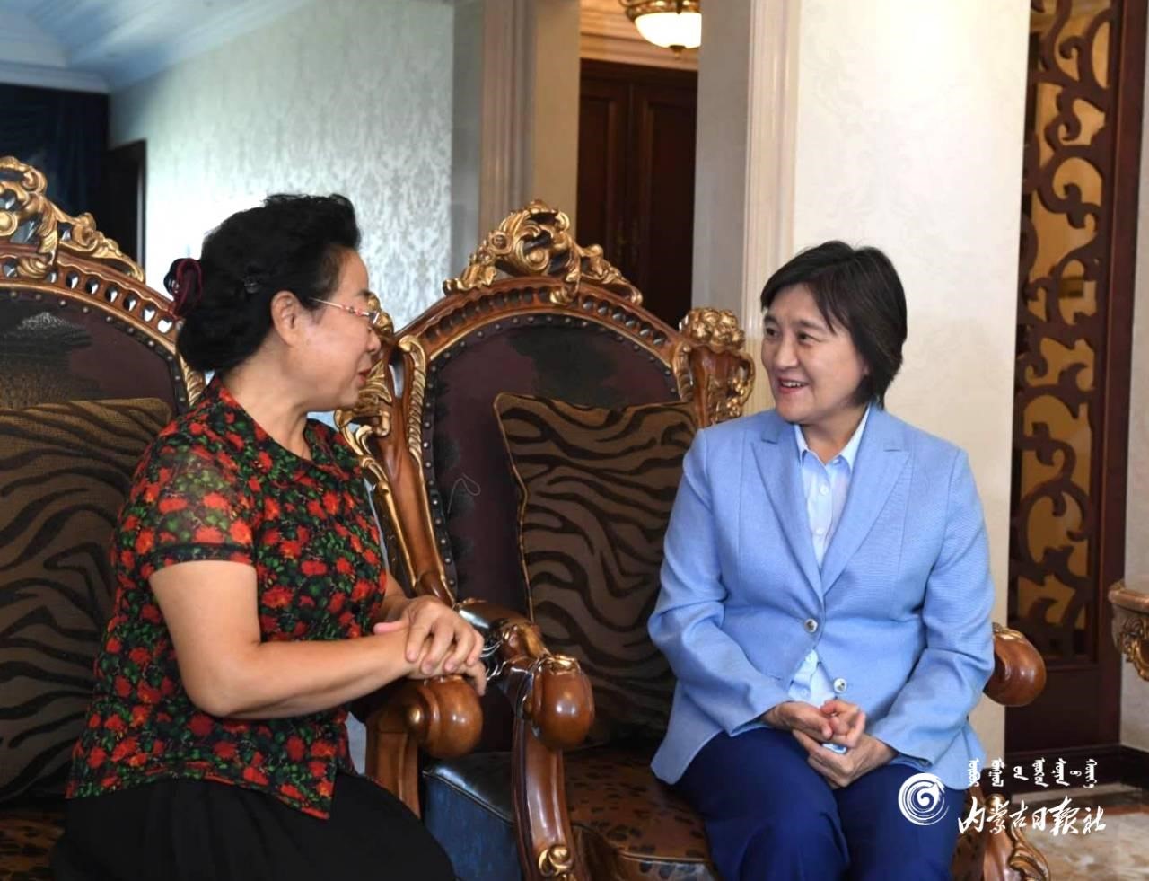 9月10日上午,自治區(qū)黨委副書(shū)記、自治區(qū)主席布小林慰問(wèn)呼和浩特市第二中學(xué)退休教師姜超霞(右)。內(nèi)蒙古日?qǐng)?bào)社融媒體記者 韓卿立 攝