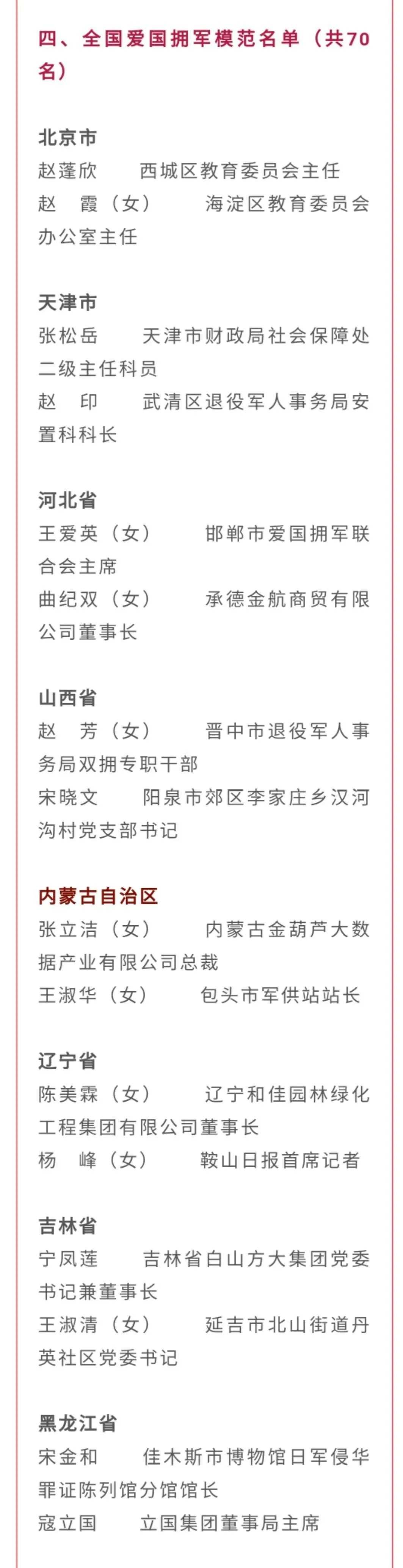 10月20日,全國雙擁模范城(縣)命名暨雙擁模范單位和個人表彰大會在北京舉行,大會宣讀了關(guān)于命名411個全國雙擁模范城(縣),關(guān)于表彰全國愛國擁軍模范單位和擁政愛民模范單位,關(guān)于表彰全國愛國擁軍模范和擁政愛民模范的決定。內(nèi)蒙古自治區(qū)13個市縣(旗)榮膺全國雙擁模范城(縣),1個鎮(zhèn)、2名全國愛國擁軍模范受到表彰。全部名單如下: