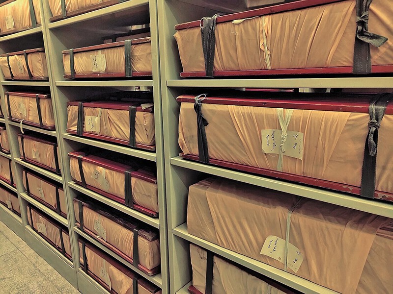 走入蒙古文古籍庫,上萬件古籍靜靜地擺放著,在昏黃的特殊燈光照射下,一排排書架金光閃閃,一個個防磁柜就像知識的巨人并肩站立,歷史在這里塵封,也在這里開啟。