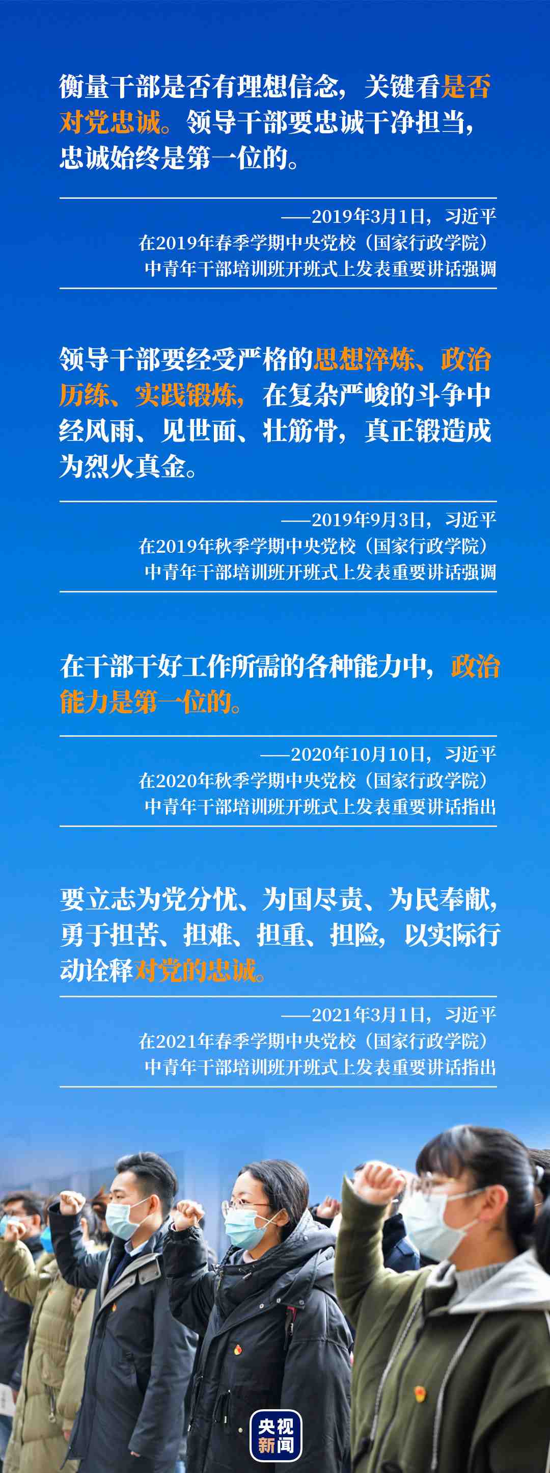 對(duì)黨忠誠(chéng)、提高政治能力是總書記在近幾年中青年干部培訓(xùn)班開班式上授課的關(guān)鍵詞。
