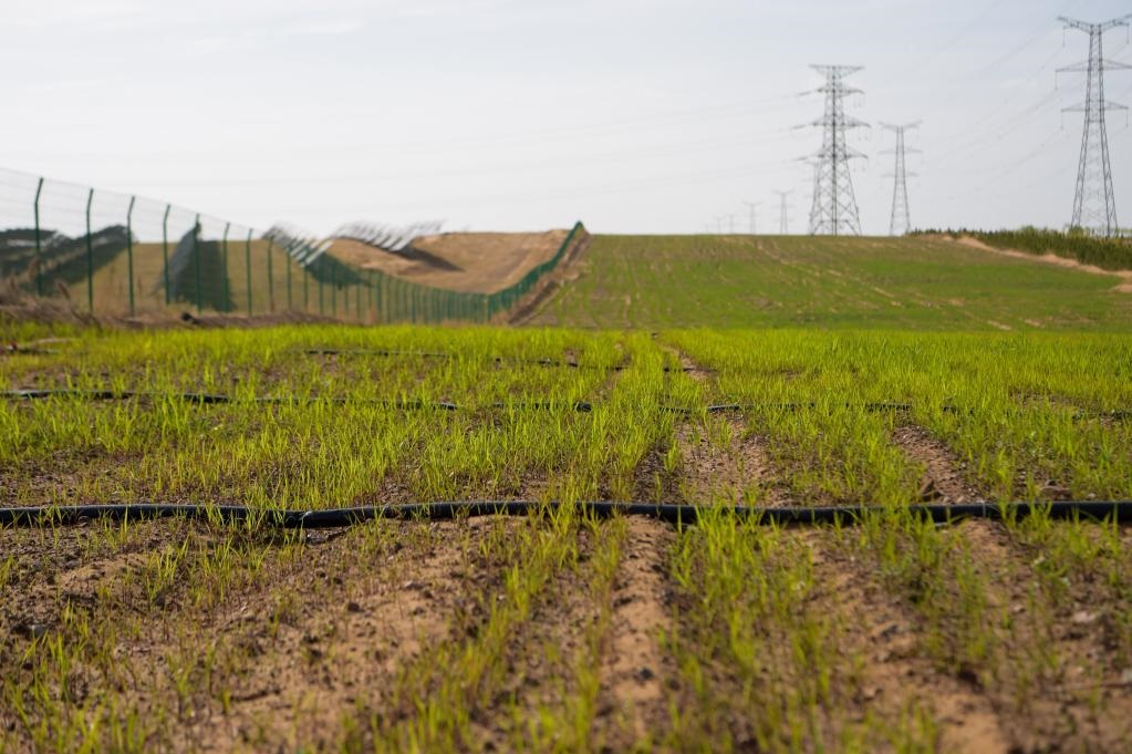 秋天的庫布其,午后的陽光照在金色沙丘上。在鄂爾多斯市達拉特旗光伏發(fā)電應用領跑基地的一片光伏板旁,馬天景和往常一樣,查看著試驗田里的牧草幼苗。