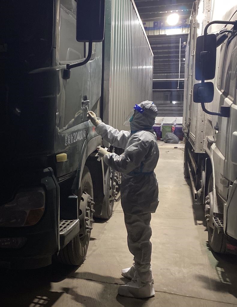 11月4日凌晨,工作人員對貨車把手采樣。(通遼市疾控中心供圖)