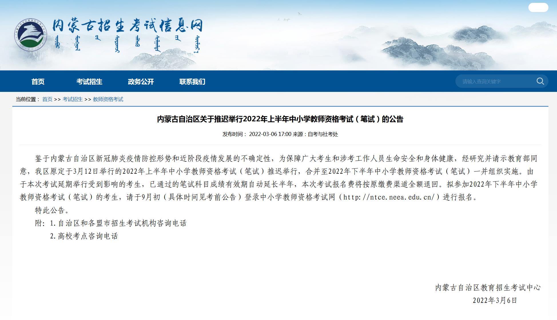 據(jù)內(nèi)蒙古招生考試信息網(wǎng)消息,3月6日,內(nèi)蒙古自治區(qū)教育招生考試中心發(fā)布公告稱,鑒于內(nèi)蒙古自治區(qū)新冠肺炎疫情防控形勢(shì)和近階段疫情發(fā)展的不確定性,為保障廣大考生和涉考工作人員生命安全和身體健康,經(jīng)研究并請(qǐng)示教育部同意,原定于3月12日舉行的2022年上半年中小學(xué)教師資格考試(筆試)推遲舉行,合并至2022年下半年中小學(xué)教師資格考試(筆試)一并組織實(shí)施。由于本次考試延期舉行受到影響的考生,已通過(guò)的筆試科目成績(jī)有效期自動(dòng)延長(zhǎng)半年,本次考試報(bào)名費(fèi)將按原繳費(fèi)渠道全額退回?! ?br/>