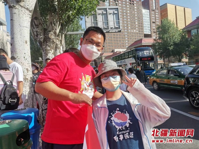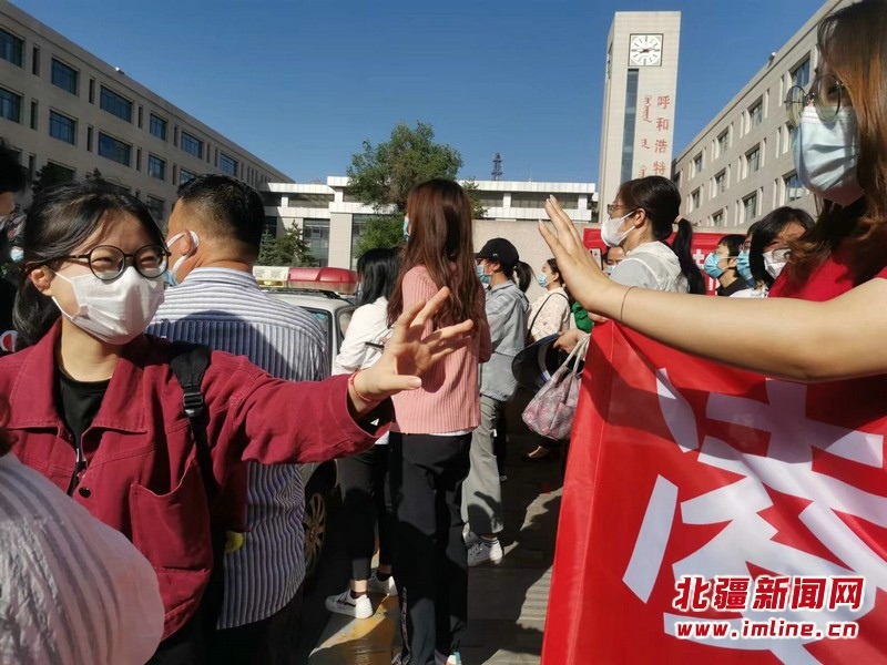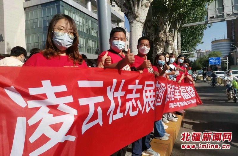 呼和浩特市實(shí)驗(yàn)中學(xué)察哈爾校區(qū)的送考教師身穿旗開(kāi)得勝的紅色T恤,戴印有“金榜題名”的紅色口罩為學(xué)生加油助威,并祝愿所有考生“凌云壯志展宏圖 錦繡前程幸福路”。