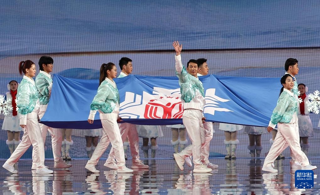 ??2月17日,中華人民共和國第十四屆冬季運(yùn)動會會旗入場。新華社記者 連振 攝