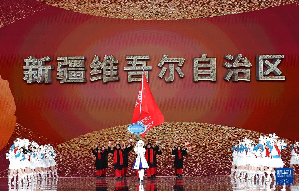 ??2月17日,新疆維吾爾自治區(qū)體育代表團(tuán)在開幕式上入場。新華社記者 李博 攝