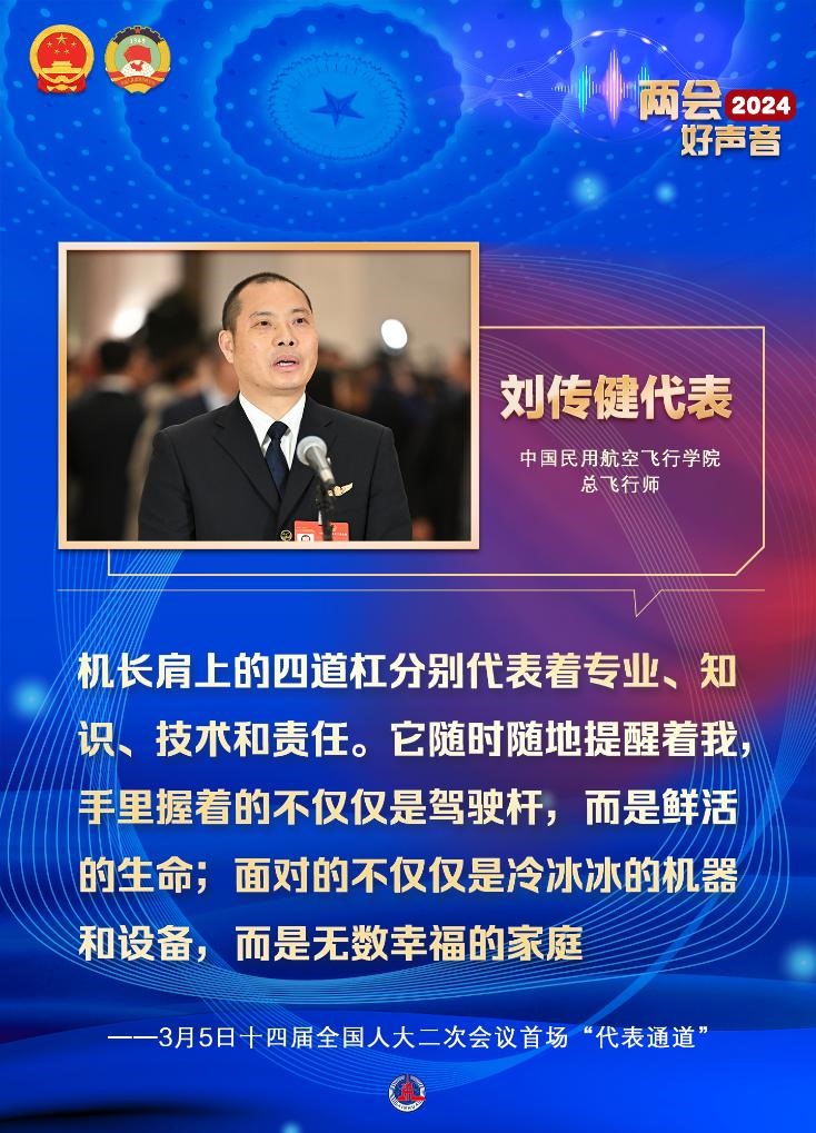 劉傳健說:“機(jī)長肩上的四道杠分別代表著專業(yè)、知識(shí)、技術(shù)和責(zé)任。它隨時(shí)隨地提醒著我,手里握著的不僅僅是駕駛桿,而是鮮活的生命;面對的不僅僅是冷冰冰的機(jī)器和設(shè)備,而是無數(shù)幸福的家庭?!?/p>