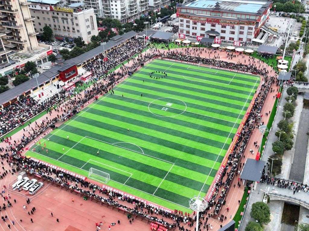 2月3日,觀眾在“村超”賽場等待活動開始(無人機照片)。新華社記者劉續(xù)攝
