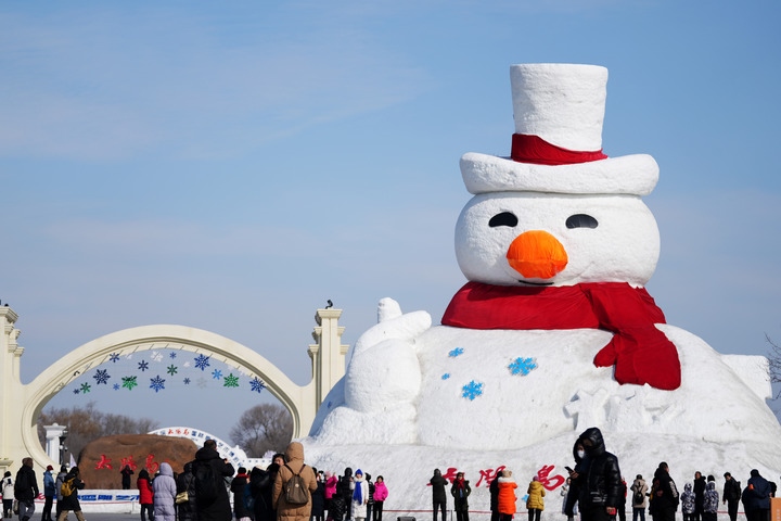 2月24日,在哈爾濱太陽島雪博會園區(qū)門口,游客在大雪人前留影。新華社記者王建威攝