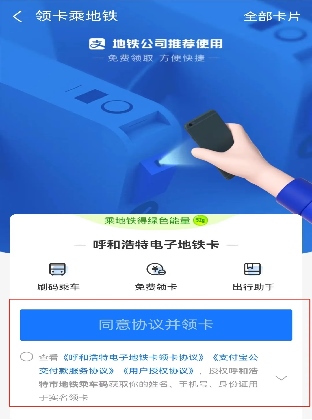 首次使用先進行“同意協(xié)議并領(lǐng)卡”并領(lǐng)取“呼和浩特電子地鐵卡”。