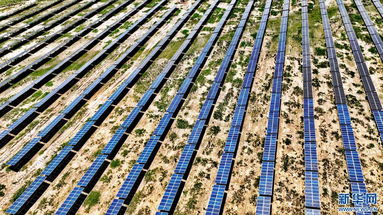 ??6月14日,在地處科爾沁沙地邊緣的翁牛特旗其甘地區(qū)拍攝的光伏發(fā)電場(chǎng)。新華網(wǎng)發(fā)(李富 攝)