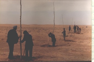 ??“領(lǐng)導都帶頭干,王占文書記包的我們奮勇大隊,帶我們種沙柳。全大隊11個生產(chǎn)隊,排著隊、唱著歌,把紅旗插在各自的沙梁上。民兵也領(lǐng)著娃娃們來種樹,他們掏坑,娃娃遞樹栽子。幾年下來,把奮勇大隊種成了自治區(qū)最早的萬畝林大隊。馮耀華當時是公社副書記,包的是阿魯柴登,郭巨才當時是公社副主任,包了什里加汗。王占文還專門組織了測繪隊,繪出地圖,統(tǒng)一規(guī)劃,給所有農(nóng)田種上防護林,定下在哪修路種上行道樹。20年后按圖修路時,施工隊發(fā)現(xiàn),路基兩旁的樹早種好了。”白三寶回憶。