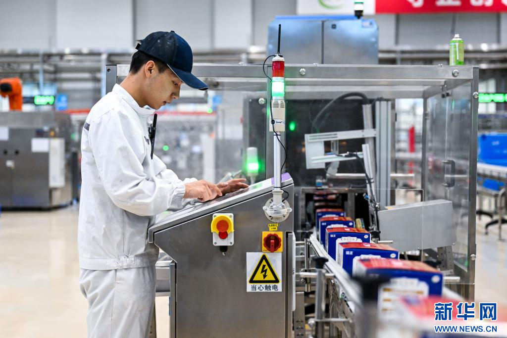 1月9日,在呼和浩特市伊利現(xiàn)代智慧健康谷液態(tài)奶全球智造標(biāo)桿基地,工人在生產(chǎn)線(xiàn)上操作設(shè)備。