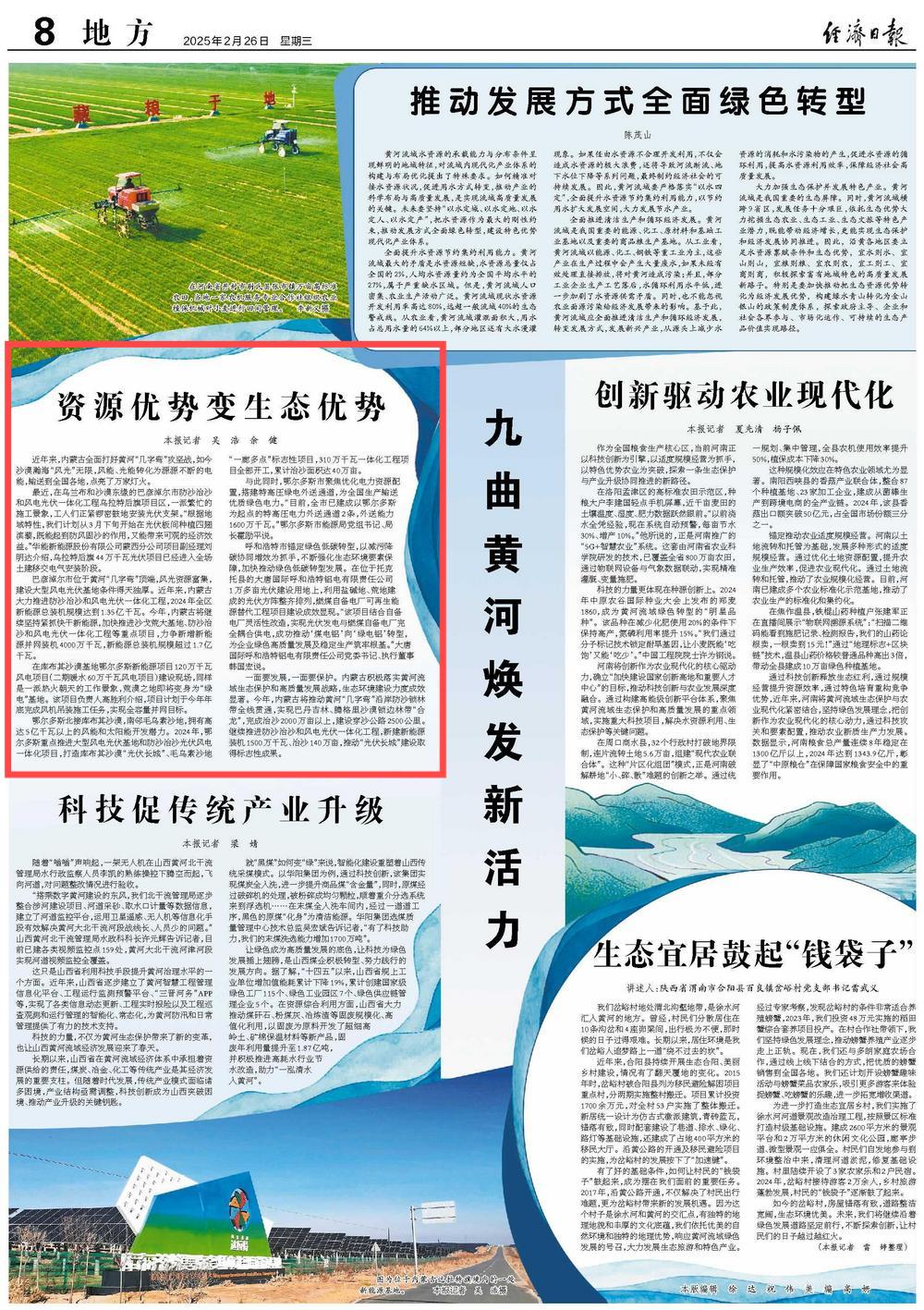 2025年2月26日,《經(jīng)濟(jì)日?qǐng)?bào)》第8版刊發(fā)題為《資源優(yōu)勢(shì)變生態(tài)優(yōu)勢(shì)》的文章,報(bào)道了近年來,內(nèi)蒙古全面打好黃河“幾字彎”攻堅(jiān)戰(zhàn),如今沙漠瀚?!帮L(fēng)光”無限,風(fēng)能、光能轉(zhuǎn)化為源源不斷的電能,輸送到全國各地,點(diǎn)亮了萬家燈火。