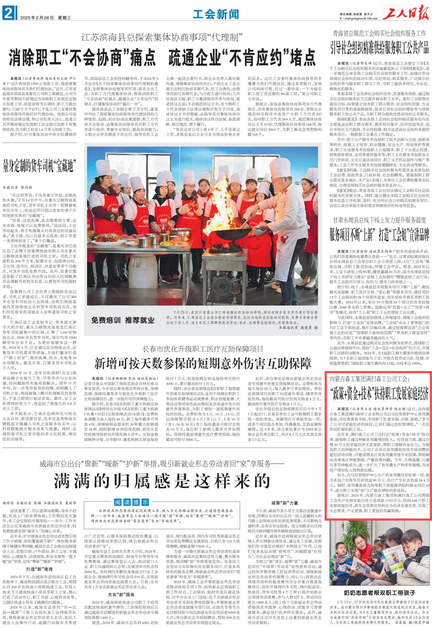 2025年2月26日,《工人日報(bào)》第2版刊發(fā)題為《內(nèi)蒙古森工集團(tuán)滿歸森工公司工會:“政策+資金+技術(shù)”扶持職工發(fā)展家庭經(jīng)濟(jì)》的消息,介紹了近年來,內(nèi)蒙古森工集團(tuán)滿歸森工公司工會打出“政策+資金+技術(shù)”組合拳,鼓勵職工通過種植食用菌增加收入。