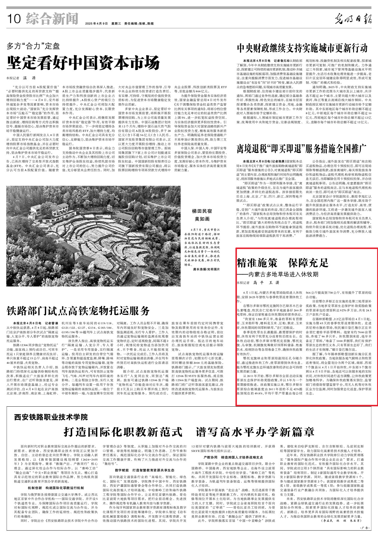 2025年4月9日,《光明日報(bào)》第10版刊發(fā)題為《精準(zhǔn)施策 保障充足——內(nèi)蒙古多地草場進(jìn)入休牧期》的文章,報(bào)道了4月1日起,內(nèi)蒙古多地草場陸續(xù)進(jìn)入休牧期,安排2025年禁牧與春季牧草返青期休牧工作。