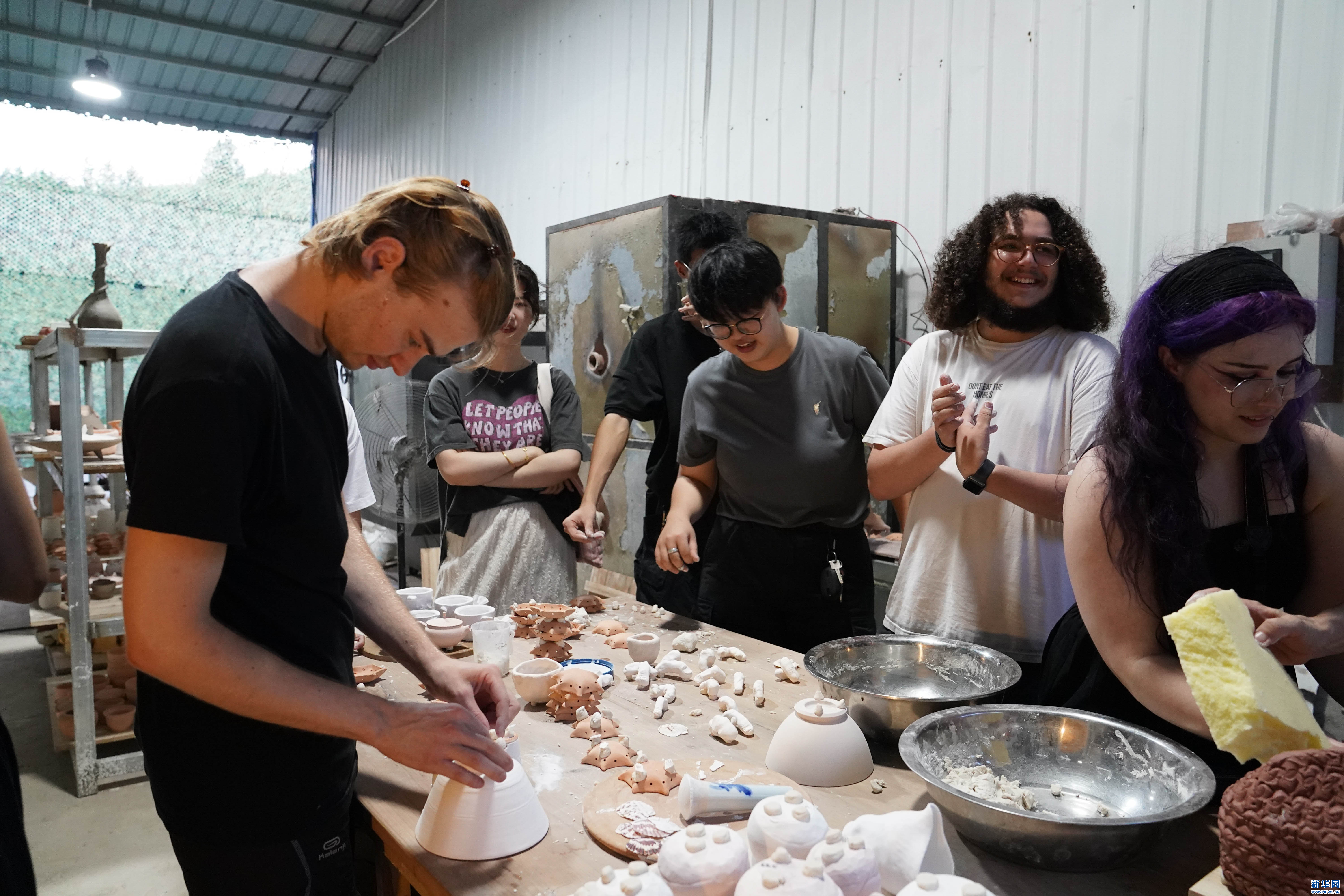 2024年7月17日,參觀者在江西景德鎮(zhèn)陶瓷大學(xué)的一處窯爐旁一起創(chuàng)作、討論。新華社記者 周密 攝